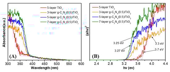 (A) Ultraviolet-visible diffuse reflectance spectrum (UV-vis DRS) of 5-layer TiO2 thin film and different layers of g-C3N4(0.5)/TiO2; (B) The bandgap curve after conversion of the Tauc formula.