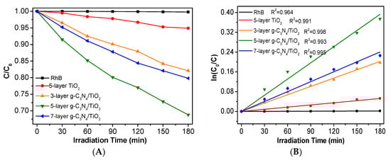 (A) Photocatalytic degradation of Rh B by 5-layer TiO2 and g-C3N4/TiO2 thin films with different spin-coating layers. (B) The first-order kinetic fitting curve of the photocatalytic degradation.