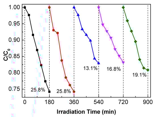 Except for the easy operation, cyclic stability is another important factor for the industrial application of thin-film photocatalysts. The antibiotic residue is another refractory pollutant in water, and the photodegradation of tetracycline hydrochloride (TC-HCl) was evaluated as the model reaction to study the photocatalytic activity as well as the stability. Five-layer g-C3N4(0.5)/TiO2 is selected for this evaluation and the result is shown in Figure 7. A total of 25.8% TC-HCl is degraded after 180 min of visible-light irradiation, and no reduced photocatalytic performance is observed at the 2nd cycle. However, a slight decrease in the photocatalytic activity is present after the 2nd cycle, which may come from the loss of weakly attached photocatalysts. Then, no further activity loss in the other cycles is observed, indicating that the prepared thin-film photocatalyst has stability.