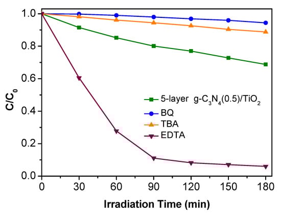 The capture experiments were carried out to identify the main active substances in the photocatalytic process for understanding the corresponding reaction mechanism. Benzoquinone (BQ), tert butyl alcohol (TBA), and ethylene diamine tetraacetic acid (EDTA) were added into the Rh B solution as the trapping agent for superoxide radical (O2•−), hydroxyl radical (•OH), and hole (h+), respectively []. As shown in Figure 8, the photocatalytic effect is significantly improved after the introduction of EDTA, which suggests that h+ is not responsible for the photodegradation. However, the photocatalytic activity is prominently inhibited after the adding of BQ and TBA. This indicates the existence of •OH and O2•− and they both play a vital role in the above photocatalytic degradation.