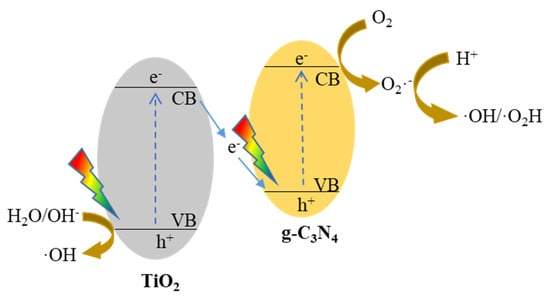 The reaction mechanism is discussed according to the above trapping experiment. If a traditional heterojunction is formed at the interface of 5-layer g-C3N4(0.5)/TiO2, photo-generated electrons may be concentrated in the conduction band of TiO2, and photo-generated holes are transferred into the valence band of g-C3N4. However, the valence band energy of g-C3N4 is less than the energy required for the formation of •OH, which cannot oxidize H2O/OH- into •OH to participate in the photocatalytic reaction. Therefore, the traditional heterojunction is not responsible for the photodegradation of Rh B, and the transport of photo-generated electrons and holes in photocatalytic reactions must follow the all-solid-state Z-scheme process, which is in correspondence with previous articles [,]. The transport process of all-solid-state Z-scheme heterojunction carriers is shown in Figure 9. The excited electrons in TiO2 transfers from its conduction band to the valence band of g-C3N4. Then, the electrons are excited to the conduction band of g-C3N4 and react with the substrate to form active species. It might be pointed out that •OH is generally produced from the direct oxidation on the holes. However, it is difficult to completely exclude the formation of •OH from the consecutive reactions [,]. Therefore, another possible formation of •OH from the consecutive conversion of O2•− is also given in Figure 9.