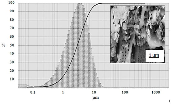 Powder particle size distribution of diatomite powder. Inset: SEM microstructural image of precursor diatomite powder showing crushed frustules with some porous structure.