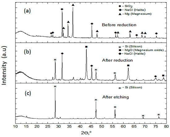 XRD pattern: (a) reaction mixture before the metallothermic reduction reaction (MRR), (b) remaining loose powder after the MRR, and (c) silicon obtained from remaining loose powder after etching.