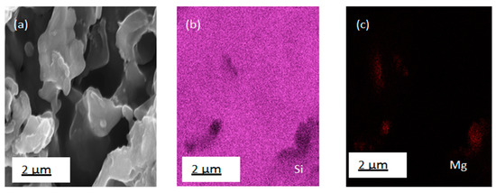 EDS elemental mapping of silicon nanoflakes after purification: etching with 1 M HCl, 5% HF and washing in deionized water. (a) SEM image of nanoflakes, (b) Si, and (c) Mg < 1% average.