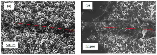 From FIB-SEM, no clear contrast could be seen between the silicon nanoflakes and the wafer surface, suggesting an even bonding of the flakes to the silicon wafer. In Figure 9a,b, SEM images of the adhesion scratch test of the nanocrystalline Si coating on Si wafer substrate are presented. It is apparent from this qualitative assessment that good bonding was achieved, resulting in a ‘ploughing’ response without any flaking or spalling off of the coating.