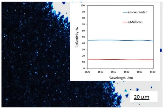 Optical microscope image of the as-etched silicon nanoflakes. Inset: reflectivity of silicon nanoflakes (nf-silicon; black) and silicon wafer surface (white surface) in the infrared region.
