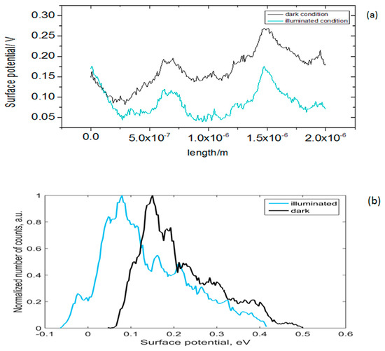 The topography and surface potential measurements of silicon nanoflakes are presented in Figure 12 and Figure 13. As already shown in the SEM microstructural images and FIB sections, there was a significant variation in the thickness of the silicon nanoflakes formed. These were further confirmed by AFM topography (Figure 12a). Such variation may however, have an effect on the surface potential measurements due to topography crosstalk. In Figure 12b,c, VCPD mapping of the silicon nanoflakes under both dark and illuminated conditions are shown. The VCPD cross-section profiles of the silicon nanoflakes under dark and illuminated conditions are shown in Figure 13a and the VCPD distribution in Figure 13b. Surface potentials measured under the illuminated condition were lower than under the dark condition.