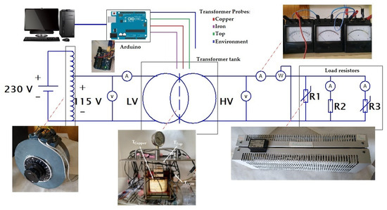 The platform was subjected to three tests with different load levels, represented by load indexes C (C = 0.7, C = 1, C = 1.3), depending on the power consumed by the circuit respecting its rated power. The load levels are reached by controlling three variable resistors, shown in the scheme of Figure 2. Table 3 summarizes the currents, voltages and resistances applied during the tests for each load index. Using these values, we assure the study of the behaviors of the samples at different temperatures. The overload regime gives also temperatures closer to those found in actual distribution and power transformers.