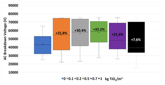 The results from the breakdown voltage tests are summarized in Figure 4. Here, the distribution values obtained during the tests are shown, including the mean values (represented by a cross) and the variations noticed in these mean values with respect to the one gotten with the base fluid, in percentages.