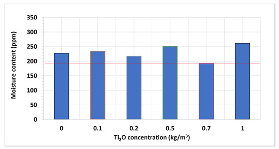 This occurs even though most of the nanofluid samples have slightly larger contents of moisture than the base fluid one, 226.9 ppm (Figure 5). These nanofluid samples may have shown improvements that were even more pronounced regarding the base fluid if they had the same moisture contents, according to the literature [36,37]. Additionally, the sample with the optimal concentration is also the second one with the most moisture (251.0 ppm), while the closer-concentration samples present moisture contents lesser than that of the base fluid (217.0 ppm in 0.2 kg/m3 and 191.9 ppm in 0.7 kg/m3 nanofluids). Thus, the optimal-concentration nanofluid may have been more noticeable if all the samples had the same moisture contents. Regarding the 1 kg/m3 nanofluid sample, although it presents the most moisture (261.9 ppm), this is no really far from some of the preceding samples. Therefore, the fall in breakdown voltage regarding the other nanofluids is not only attributable to the moisture, it is also due to an excessive concentration of nanoparticles, following the trend started at 0.7 kg/m3.