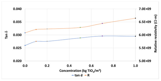 Regarding other typical dielectric parameters measured in this kind of study, the Dielectric Dissipation Factor (tan δ) is affected by the presence of nanoparticles, and it is slightly increased, from 0.0260 to 0.0295, up 13.5%, depending on the concentration (Figure 6). On this occasion the effect is less pronounced than that seen with the Fe2O3 nanoparticles with the same base fluid, up to 119.7% in the concentrations studied [29]. This difference is also noticed when focusing on the resistivity of the samples, with a slight increase with the concentration of nanoparticles, from 6.081 GΩ·m to 6.642 GΩ·m, up to 9.2% (Figure 6) against that seen with the ferrofluid [29], whose resistivity decreased with the nanoparticles’ concentration, up to −31.4%.
