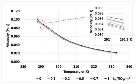 The viscosity seems to be affected by the addition of nanoparticles, as the mean variations found are higher than the test uncertainty, represented by the red dashed lines in Figure 8. These variations are up to 7.2%, depending on the nanoparticle concentration and on the temperature. Regarding these parameters, the influence of the nanoparticles on the viscosity is more noticeable as their concentration increases. Additionally, the effect of the temperature on this property is in line with the tendency of the base fluid in this sense, and the nanofluids still fulfill the recommendations set in the standards for vegetal dielectric oils (<0.0455 Pa·s at 313 K).
