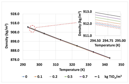The density for its part shows a similar situation (Figure 9), a logical evolution with temperature, as expected, and with the nanoparticle concentration, it obtains mean values very close to those calculated with the quantities of solid fraction and base fluid used during the preparation (despicable punctual differences that are under test error).