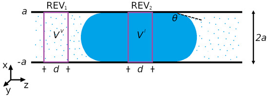 Slit pore of width with a liquid droplet in the middle, which is in equilibrium with a vapor phase on both sides. The representative volume elements are REV (vapor of volume ) and REV (liquid of volume ), both with length d. The x-axis is located at the center of the pore.