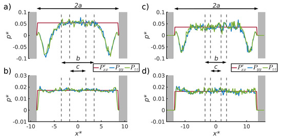 The variation in the pressure component normal to the surface walls is shown for the liquid (top) and the vapor phases (bottom) in Figure 4, for pore widths, (left) and (right), using = 0.15 (repelling interactions). The horizontal straight line in all sub-figures is the -component extrapolated to the walls. We know there is bulk fluid in the core, as the pressures in and are the same, so this component is equal to the bulk pressure. For the other curves in the figure, the tangential components of the pressures (the - and -components) fall on top of each other. The distances , b and c between the 4 dashed lines and the pore wall (grey) in the figure represent three fluid volumes, of increasing size ( and ). These are the core volume (width c, volume ), the core plus layer 1 (width b, volume ) and the whole volume (width , volume ). The distance is the width of the channel.