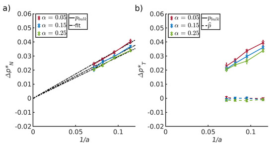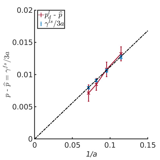 Figure 6 (left) shows the difference between the normal components of the bulk pressures in the liquid and vapor. The pressure difference is shown as a function of the inverse half channel width, a, for three values of the interaction parameter , all values representing wall-fluid repulsive forces. Figure 6 (right) shows the difference between the liquid and vapor for the tangential components of the pressures, i.e., the integral pressure (dashed lines) and the bulk pressure (solid lines). Results are shown as a function of the inverse half channel width between the two pore walls, , and three fluid–solid interactions parameters . These plots allow us to test Equations (10) and (12).