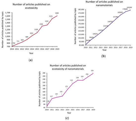 Both the study of nanomaterials and that of ecotoxicology are constantly increasing, as evidenced by the increasing number of scientific articles from Web of Science Core Collection (Web of Science, Clarivate Analytics) during 2010–2019 (Figure 1a,b). Due to the wide range of applications of nanomaterials, as well as the increased importance of protecting the environment and analyzing the ecotoxicity of potential pollutants, investigating the ecotoxicological effects of nanomaterials is essential. This is also underlined by the increasing number of scientific articles on the ecotoxicity of nanomaterials from Web of Science Core Collection (Web of Science, Clarivate Analytics) in 2010–2019 (Figure 1c). With the emergence of the need to assess the ecotoxicity of nanomaterials, the need arises to adapt standard ecotoxicity tests for testing nanomaterials.