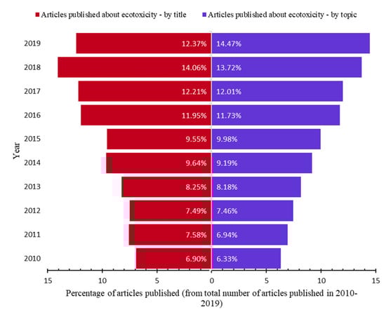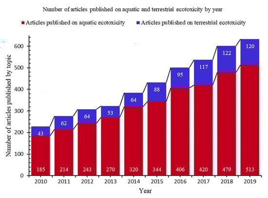 The ecotoxicological assessment developed as aquatic and terrestrial, the terrestrial assessment lagging the aquatic one [2]. Although the number of scientific articles published both in the subject of aquatic ecotoxicity and in terrestrial ecotoxicity is increasing, the ratio between the two types remains relatively constant even during the period 2010–2019, the aquatic ecotoxicity being more researched than the terrestrial one (Figure 3). This highlights the necessity to further develop the study on terrestrial ecotoxicity to reach the level of the aquatic one, or at least to get close to its level.