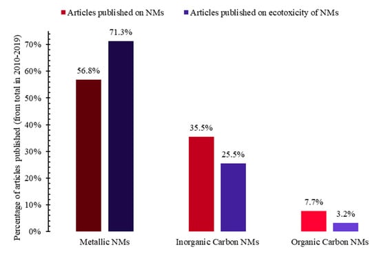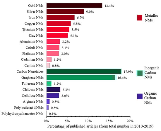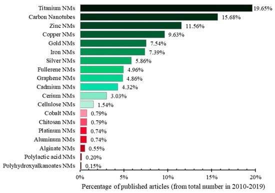 The largest percentage of scientific articles on nanomaterials from the Web of Science Core Collection (Web of Science, Clarivate Analytics) in 2010–2019 is observed in the case of carbon nanotubes, followed by fullerene-based nanomaterials and those from gold and silver. The least investigated are the nanomaterials from polyhydroxyalkanoates, polylactic acid, alginate and cerium (Figure 5).