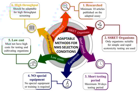 Since the assessment of ecotoxicity of NMs is imperative, the already developed and standardized assays must be sorted and selected, in order to create an efficient and adapted ecotoxicity test battery for NMs. Thus, we considered that an assay can be used to test NMs if the following conditions (Figure 6) are met: