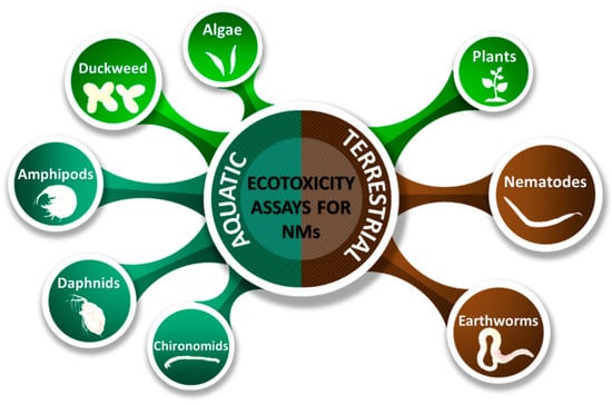Only eight standard assays were selected as being adaptable for NMs, five aquatic assays and three terrestrial ones: the algae, duckweed, amphipods, daphnids, chironomids, terrestrial plants, nematodes and earthworm assay (Figure 7).