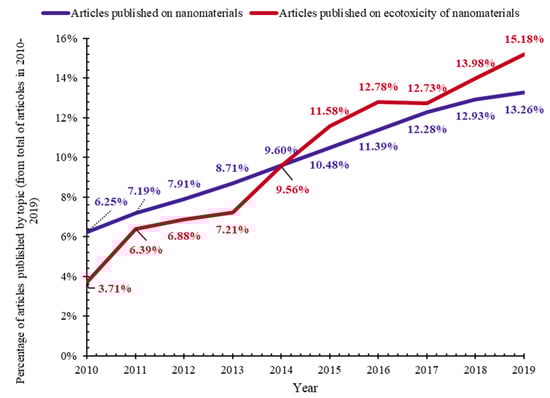 The percentage of scientific articles by year in the Web of Science Core Collection (Web of Science, Clarivate Analytics) from the total of articles in 2010–2019 is increasing (Figure 2). This highlights the increasing importance of ecotoxicological testing in all areas and the necessity of adapting these assays to the new types of materials.