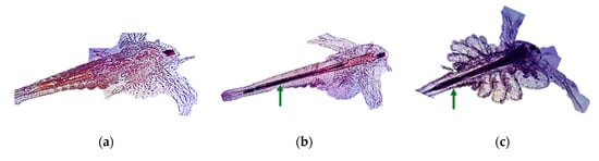- Oliveira, C.R.d.; Fraceto, L.F.; Rizzi, G.M.; Salla, R.F.; Abdalla, F.C.; Costa, M.J.; Silva-Zacarin, E.C.M. Hepatic effects of the clomazone herbicide in both its free form and associated with chitosan-alginate nanoparticles in bullfrog tadpoles. Chemosphere 2016, 149, 304–313. [Google Scholar] [CrossRef] [PubMed]