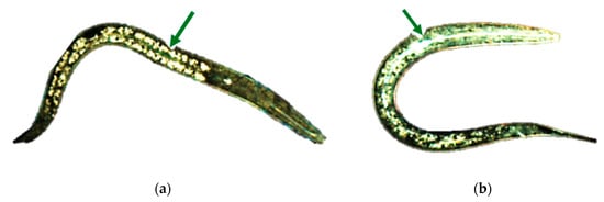 - Kleiven, M.; Rossbach, L.M.; Gallego-Urrea, J.A.; Brede, D.A.; Oughton, D.H.; Coutris, C. Characterizing the behavior, uptake, and toxicity of NM300K silver nanoparticles in Caenorhabditis elegans. Environ. Toxicol. Chem. 2018, 37, 1799–1810. [Google Scholar] [CrossRef]