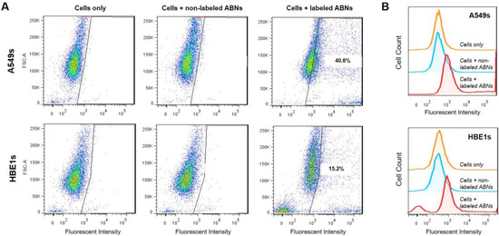 A549 adenocarcinoma cells were obtained from the American Type Culture Collection (ATCC, CCL-185TM, Gaithersburg, MD, USA). HBE1 cells were generated by Yankaskas et al. (1993) through the infection of immortalized human bronchial epithelial cells with papillomavirus [45]. Both cell types were seeded separately into 6-well plates at 3 × 105 per well and cultured until they reached 80% confluency. A549 culture medium contained DMEM, 10% FBS, and 1% penicillin/streptomycin. HBE1 culture medium contained DMEM, cholera toxin (10 ng/mL), EGF (10 ng/mL), transferrin (5 μg/mL), bovine pituitary extract (15 μg/mL), and BSA (0.5 mg/mL). ABNs were labeled with AlexaFluor 647 via carbodiimide chemistry and added to cells at 100 µg/mL (n = 3). After 12 h of culture, the medium was removed, and adherent cells were thoroughly rinsed with PBS. Cells were trypsinized and centrifuged at 200× g for 10 min, and then re-suspended and fixed in 1 mL of 4% PFA in PBS for 10 min. After fixation, cells were centrifuged to remove excess PFA and thoroughly rinsed with 1× PBS. Cells were re-suspended in sterile PBS and transferred to 5 mL polystyrene round-bottom tubes for flow cytometry to determine the percentage of the cell population that internalized ABNs (BD LSRII Flow Cytometer, San Jose, CA, USA). Alexa 647-positive cell population percentages were gated with non-treated cells and those treated with non-labeled ABNs.