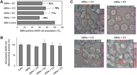 (A) Endocytosis-dependent A549 cancer cell uptake of ABNs suspended in cell media (100 µg/mL). Results are presented as a percentage of the ABN-positive A549 cell population after treatment with various endocytosis blockers (chlorpromazine hydrochloride (CH), nystin (NY), colchicine (CO), dynasore (DY)); ANOVA, * p < 0.01 versus ABN control, n = 3. Clathrin-inhibitors resulted in the greatest reduction in uptake for ABN-positive cell populations. (B) The combined effect of ABN exposure and inhibition of endocytosis on percent cellular mitochondrial activity in A549s after 30 min of culture was not significant from the control group. (C) Confocal laser scanning z-stack merged micrographs confirmed AlexaFluor 647-labeled ABNs were located inside the cytoplasm of A549s.