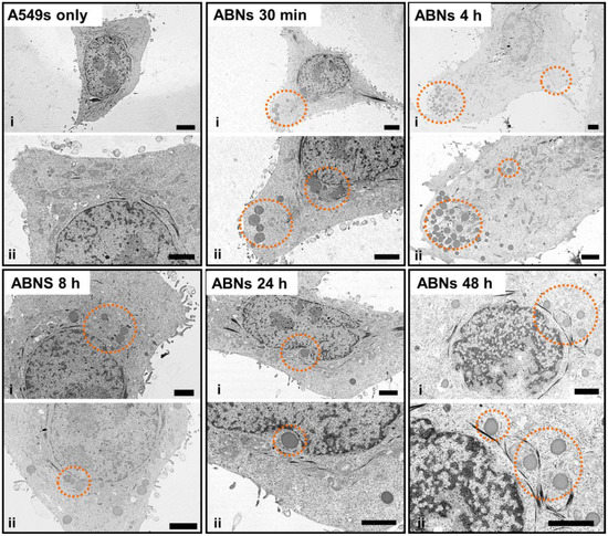 TEM images of A549 cancer cells without exposure to blank ABNs (A549s only) or after incubation with blank ABNs (100 µg/mL) for 30 min to 48 h. Two images at different magnifications are shown for each time point (scale bar = 2 µM). Dashed orange circles indicate blank ABNs within A549s.