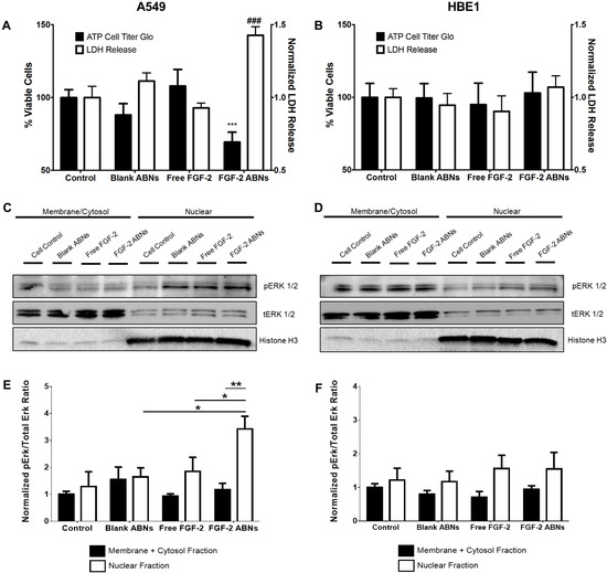 In vitro normalized viable cell number and LDH release for (A) A549 cancer and (B) HBE1 nontransformed cells after exposure to blank ABNs (100 µg/mL), free FGF-2 (20 ng/mL), and FGF-2-loaded ABNs (100 µg/mL). Western blot gel band images of membrane/cytosol and nuclear pERK1/2 and tERK1/2 activation for (C) A549 and (D) HBE1 cells. Relative intensity ratios of western blot gel bands for pERK/tERK ratios in both membrane/cytosol and nuclear fractions for (E) A549 and (F) HBE1 cells.
