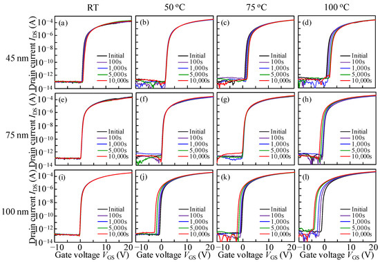Evolution of transfer characteristics as a function of DCS (VGS = VDS = 10 V) duration for 104 s for the devices with a TITZO of 45 nm measured at test temperatures of (a) 25, (b) 50, (c) 75, and (d) 100 °C; with a TITZO of 75 nm measured at test temperatures of (e) 25, (f) 50, (g) 75, and (h) 100 °C; and with a TITZO of 100 nm measured at test temperatures of (i) 25, (j) 50, (k) 75, and (l) 100 °C.