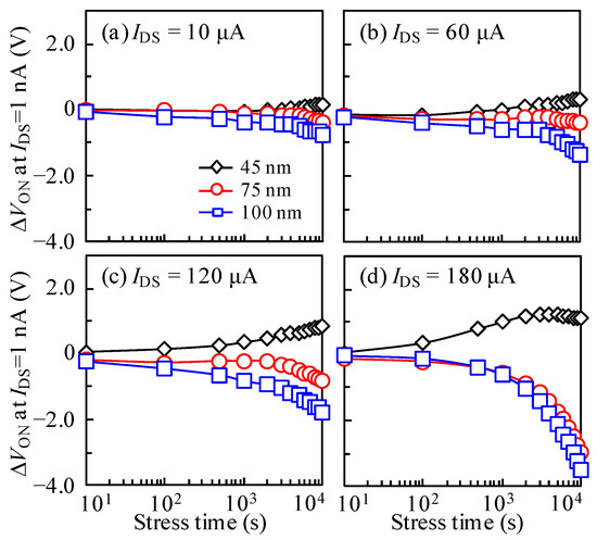 To further study DCS-caused instability of the ITZO TFTs with various TITZO, the IDS values of 10, 60, 120, and 180 μA adjusted by the gate and drain voltages (VGS = VDS) were applied at 50 °C up to the stress duration of 104 s. It should be noted that these IDS values are much higher than those applied in conventional active-matrix organic light-emitting diodes displays (~2 μA) [29]. Figure 6 displays the corresponding variation in the transfer curves of the devices. Note that the transfer characteristics of all TFTs under various IDS stresses exhibit a parallel shift without SS degradation. The corresponding ΔVON fluctuations are plotted in Figure 7. All devices exhibit acceptable reliability under 10 μA DCS irrespective of the TITZO, implying that few electron trapping sites exist in the ITZO bulk and at the ITZO/GI interface. Interestingly, with the increase in the IDS stress, a ΔVON with a significant TITZO dependence was observed. For the 45 nm TITZO TFT, the VON positively shifted with the increase in the IDS stress. The positive shift behavior was enlarged by increasing the stress duration. For the 180 μA IDS stress, the transfer curves parallel shifted by 1.21 V towards the positive VGS direction under the stress duration of 3000 s. In the subsequent stress time, the ΔVON shift was saturated in a short stress time, and then slightly moved back to 1.10 V. In contrast, when the thickness increased to 75 and 100 nm, the transfer curves completely changed in the negative VGS direction irrespective of the IDS stress. Under the 180 μA IDS stress, the ΔVON of the TFTs with TITZO of 75 and 100 nm decreased by −2.98 and −3.50 V, respectively. The results demonstrate that, under identical IDS stress, the negative VON shift is accelerated with the increase in TITZO.