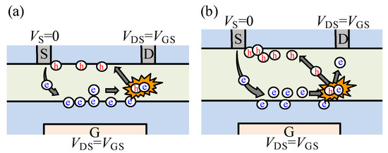 As the IDS stress increases, the electron trapping probability is enhanced. When the IDS increases to 180 μA, electron trapping is the main origin of the positive VON shift within the stress duration of 1000 s. Consequently, a saturated trapping behavior is then observed. When the stress time exceeds 3000 s, hole trapping seems to become a major reason for the slightly negative VON shift. It can be explained by the impact ionization phenomenon [21], which induces the generation of an electron-hole pair. Consequently, the excited charges are trapped at the front- and back-channel interfaces. However, the electron trapping seems to become saturated at the gate insulator/ITZO region. Therefore, the extra electrons are drained from the drain electrode. The holes generated near the drain side migrate to the source region along the back-channel interface and accumulate near the source region. As a result, the VON shifts from a positive to negative VGS direction. When the TITZO increases to 75 nm and more, a clear negative VON shift is observed under various IDS stresses, demonstrating that hole trapping at the ITZO/etch-stopper interface is the main cause of the negative VON shift. With the increase in the TITZO, the negative VON shift is accelerated under the identical IDS stress. The results demonstrate that, for the thicker TITZO TFTs, electrons injected from the source will experience a longer duration prior to reaching the gate insulator/ITZO interface under the vertical electric field. Simultaneously, electrons are subjected to a driving force from the lateral electric field. It is noted that the identical IDS bias is controlled with different VGS = VDS values for various TITZO TFTs. Therefore, the probability of electron-induced impact ionization is greatly increased with sufficient space and time, contributing to more excited carriers (Figure 8b). It is noted that the forward and reverse transfer curves were compared after DCS, and the similar transfer curves were obtained without SS degradation. Therefore, the results suggest that the observed phenomenon is hard to attribute to the increase in the donor-like states near the source side of the TFTs.