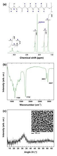 (a) 1H NMR spectrum of poly (glycerol sebacate) (PGS) in deuterated acetone. The typical chemical structure of PGS is shown at the top of the graph. (b) FTIR spectrum of PGS. The characteristic peaks are indicated in the graph. (c) XRD pattern of the 45S5 bioactive glass microspheres and their morphology analysed by SEM (inset).