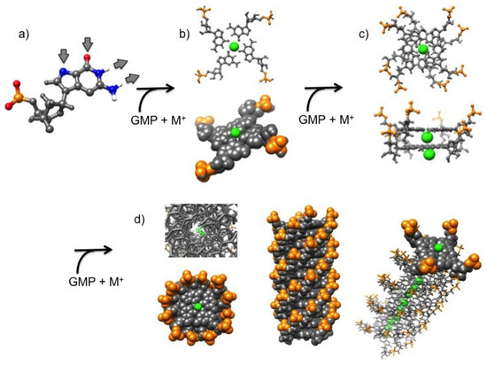 Guanosine self-assembly process in absence of axial backbone. Green: counterions (also indicated as M); orange: phosphate groups. (a) the guanosine 5′-monophosphate, GMP. The donor and acceptor groups are indicated by the arrows; (b) the G-quartet (ball-and-stick and van der Waals models); (c) the G-octamer (ball-and-stick model), top and lateral views; (d) the G-quadruplex (ball-and-stick and van der Waals models), top and lateral views.