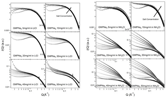 SAXS profiles for GMPNa in LiCl and NHCl solutions at 24 °C. In each frame, GMP concentration is reported. The grey color of the lines is related to the salt molarity of the solution, that increases, as the arrow indicates, from 0.06 M up to 1.0 M.