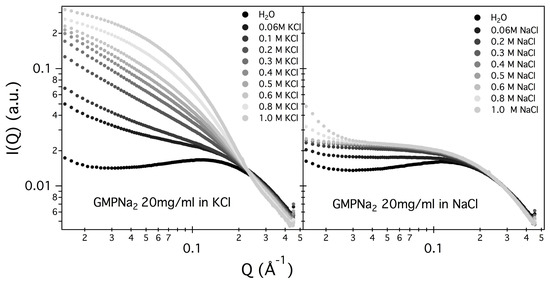 Results obtained in the presence of sodium ions are rather different, because the increasing of the scattering at low Q values is really less evident in respect to the potassium ions case (see Figure 5, which compares at the same scale SAXS data from GMPNa samples in KCl and NaCl at the same concentration). Along the entire range of explored GMP concentrations, the presence of Na promotes the formation of G-quadruplexes, but further nucleation and elongation processes are probably very scarce.