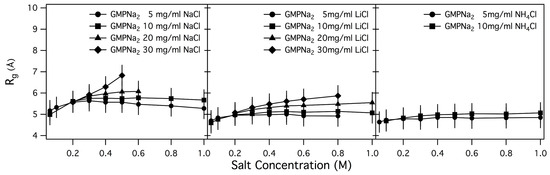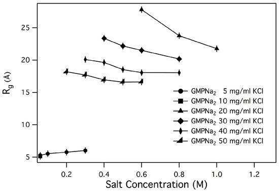 As a general result, it can be observed that only small changes in the radius of gyration are detected by increasing the ionic strength, while an increase of GMP concentration leads to an increase of . Changes are small in the case of samples prepared in NaCl, LiCl and NHCl, while s for samples prepared in KCl are surprisingly larger, confirming the already suggested capability of K to induce aggregation. Even if in the presence of chemical equilibrium between different aggregate species (as in the present case, illustrated in Figure 1) the application of the Guiner law can lead to unphysical averaged parameters, it can be suggested that an increase of the size of the particles in solution or a change in the relative amount of smaller and larger aggregates occurs when the GMPNa concentration increases [10,28]. Indeed, the calculated radii of gyration of a GMP molecule and a G-quartet are 5.0 and 9.5 Å, respectively.