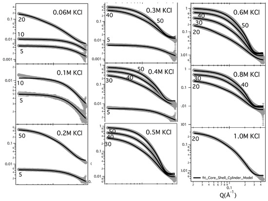 As an example, the fitted curves related to GMPNa in KCl samples are reported in Figure 9, while a few comparisons for samples prepared in KCl and in NaCl are shown in Figure 10. In any case, the quality of the fit can be appreciated, confirming that all the curves can be very well reproduced by considering the core-shell cylinder model. The corresponding G-quadruplex lengths are reported in Table 4.
