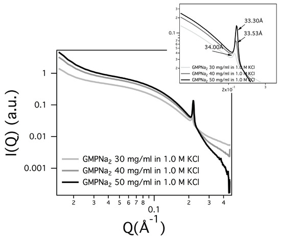 In several SAXS curves, a Bragg peak appears (see Figure 11), suggesting that the particle number density is so high, and the particle-particle repulsive interactions so low, that the G-quadruplexes adopt a liquid-crystalline order [7,10,32]). Because in all the different cases only one Bragg peak was detected, peak indexing was not possible, but previous structural results [32] provided continuity arguments to describe the liquid-crystalline phase. The observed Bragg peak was then considered the first order of a 2D hexagonal pattern, so that the unit cell dimension (which in the hexagonal phase corresponds to the lateral distance between two parallel G-quadruplexes) was derived. As expected, the unit cell parameter depends on concentration (the unit cell decreases when the GMPNa increases, see the parameters reported in Figure 11). Moreover, because the screening effect due to counterions, the unit cell dimension decreases when the salt concentration increases (e.g., for GMPNa 50 mg/mL sample, the unit cell reduces from 33.8 to 33.5 Å when KCl content changes from 0.8 to 1 M; in the same condition, the unit cell of the GMPNa 40 mg/mL sample shows a decrease from 33.5 to 33.3 Å).