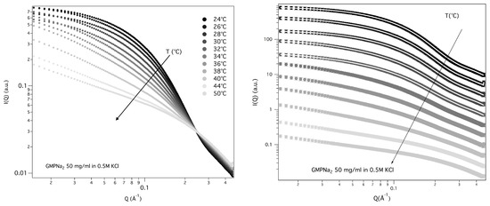 The structural properties of GMPNa 50 mg/mL prepared in 0.5 M KCl were also investigated as a function of temperature, from 24 to 50 °C. SAXS data, reported in Figure 12, show that the overall SAXS intensity decreases on heating, suggesting that high-temperatures destabilise the aggregates and determine quadruplex fragmentation.
