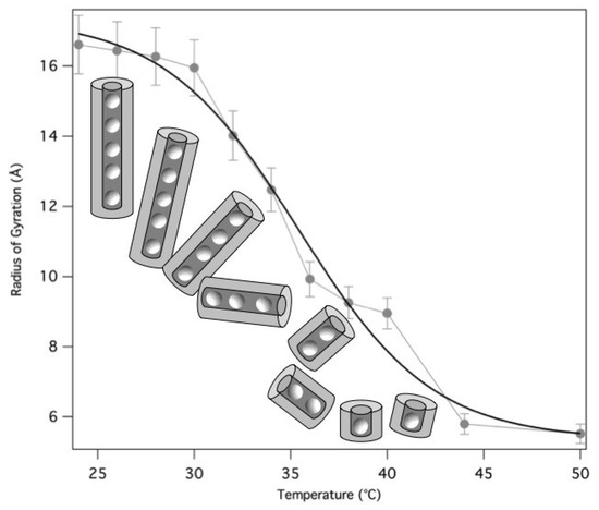 The derived radii of gyration are reported as a function of temperature in Figure 13. The fragmentation can be modelled by a Hill equation [33], suggesting that the binding of G-quartets on the quadruplexes is cooperative.