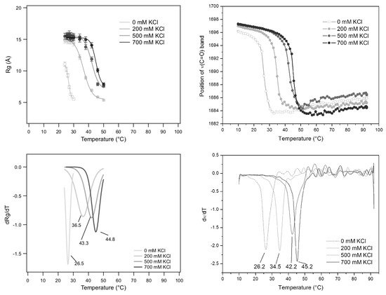 FTIR and SAXS results are reported in Figure 14. First, the temperature-induced behaviour compares well with the one already described in Figure 13 for GMPNa (50 mg/mL and 0.5 M KCl), the main difference being the inflection-point temperature (): the more the GMP concentration increases, the more the inflection-point temperature rises. Second, at the considered GMP concentration of 80 mg/mL, both s and carbonyl stretching modes of guanine show a very similar temperature dependence, indicating that in both cases the quadruplex fragmentation process is monitored. However, the temperature at the flex shows a strong dependence on KCl molarity, suggesting that the cation concentration controls the G-quadruplex disassembling temperature. A negative exponential function fitted to the melting temperatures as a function of KCl concentration led to °C, °C and M ( = 2.75), which indicate a strong effect on G-quadruplex thermal stability ( increases more than 22 °C, passing from 0 to 1 M KCl). Considering a very elementary model for the diffusively bound layer of ions around G-quadruplexes [38], it can be calculated that the exponential constant corresponds to the molar concentration of G-quartets in solution (0.055 M) added to the molar concentration of the 75% of GMP charges (0.33 M). Because osmotic stress experiments performed on the same system indicated that up to 1 M KCl, there are 12% of G-quadruplex charges not balanced by counter-charges [39,40], the strong sensitivity observed here for K is probably determined not only by its preferred binding to the inner G-quartet sites, but also by a high degree of very effective and specific charge neutralization on the G-quadruplex surface.