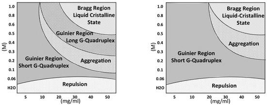 Phase diagrams for GMPNa in K (left side) and in Na (right side). Repulsion: very short, strongly interacting quadruplexes. A correlation band characterise the SAXS curves; Guinier Region—Short G-Quadruplex: short quadruplexes. SAXS curves show an extended Guinier region; Aggregation: elongated, polydisperse quadruplexes. In the SAXS curves, the Guinier region is lost; Guinier Region—Long G-Quadruplex: elongated, monodisperse quadruplexes. SAXS curves show an extended Guinier region; Bragg Region—Liquid-Crystalline State: long quadruplexes, packed according a partially ordered hexagonal lattice. SAXS curves show Bragg peaks.