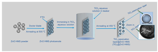 The surface elemental composition of the TiO2@ZnO HMS photoanode (10-min) obtained by immersing ZnO HMS photoanode in TiCl4 aqueous solution for 10 min was characterized by EDS elemental mapping, which is shown in Figure 3. Ti, O, and Zn elements are detected from the selected zone of the photoanode. These elements are uniformly distributed on the surface of photoanode, further proving the formation of TiO2 passivation layer on ZnO HMS photoanode. Figure 4 illustrates the formation mechanism of TiO2@ZnO HMS. First, ZnO HMS are doctor bladed onto the surface of FTO glass, forming ZnO HMS photoanode, then Ti4+ precursors are absorbed by ZnO HMS photoanode when immersed in TiCl4 aqueous solution. Finally, Ti4+ precursors are oxidized into TiO2 nanoparticles during the annealing process, assembling into TiO2 passivation layer on surface of ZnO HMS photoanode. The thickness of passivation layer are controllable by adjusting immersing duration in TiCl4 aqueous solution.