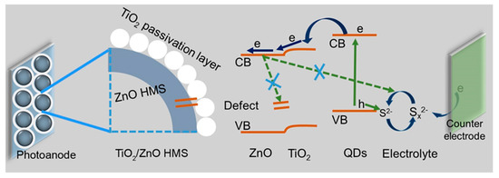 From UV-vis, IPCE, and EIS results, it is obvious that enhancement of LHE and decrease of charge recombination play decisive role in TiO2@ZnO HMS based solar cell for the improvement of Jsc and Voc. As discussed above, a possible mechanism for the contribution of TiO2 passivation layer toward improve QDSSC performance is proposed in Figure 10. First, the formation of TiO2 passivation layer can enhance the adsorption of QDs, improving the light capture ability. Second, the energy level between ZnO and TiO2 can prevent the back transfer of electrons in ZnO with polysulfide electrolyte, increasing electron lifetime. Therefore, it can be concluded that the increased light harvesting and charge collecting efficiency caused by TiO2 passivation layer lead to the improvement of Jsc and Voc, resulting in the superior photovoltaic performance of TiO2@ZnO HMS-based QDSSC. However, the lower Voc and FF seem key factors that limit the further improvement of PCE, leading to our champion solar cell is still lower than the best solar cell reported in literature [1,4]. Some factors including the types of QDs, electrolyte, and counter electrode may have a role in enhancing the Voc and FF. In future, we will pay more attention in developing new types of sensitizers or counter electrodes to realize the full utilization of light and band alignment to boost the Voc and FF that may further help to enhance PCE of QDSSC based on TiO2-passivated ZnO HMS architectures.