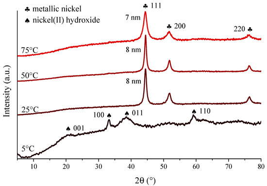 In the X-ray diffractograms (Figures S1 and S2, Supporting Information), the three reflections with Bragg indices 111, 200 and 220 can be observed indicating the successive evolution of face-centred cubic structure of Ni crystallites (JCPDS#04-0850) in the ultrasonically-aided syntheses as well as those performed with mechanical stirring or without stirring (Figure S2). However, intense baseline rise is seen between 10° and 20° 2θ values, a sign for the presence of amorphous phase, for the samples prepared without stirring and low intensity sonication (30 W power and 20% ultrasound emission periodicity). Moreover, significant reduction in the primary crystallite sizes can be observed due to ultrasonic treatments compared to the samples prepared in the non-stirred or the mechanically stirred ways (Table 1). Nevertheless, the estimated sizes only changed slightly on varying the ultrasound operation parameters. On increasing the ultrasound power density, the ultrasound waves with enhanced amplitudes and accelerated emission periodicity resulted in only slight growth of the crystallites, presumably, due to the more vigorous liquid motion and mass transfer induced. In ultrasound treatments, the influence of solvent temperature is generally twofold: the higher temperature means increased vapour pressure inside the cavitation voids and results in less intense collapses, while the formation of cavities got more facile due to the weakening matrix interactions (dipole, van der Waals, hydrogen bonding) between the solvent molecules. To map the exact effect of the ultrasound treatment at various temperature on the formation of nickel nanoparticles detailed investigations were performed between 5 °C and 75 °C (Figure 1). Interestingly, the X-ray powder diffractograms show similar primary crystallite sizes (7–8 nm); this was a remarkably different observation compared to the mechanically stirred cases reported in our previous study [49], where the increasing temperature resulted in the gradual growth in crystallite sizes from 6 nm (at 5 °C) to 14 nm (at 75 °C). On ultrasonic treatment at 25 °C, 50 °C and 75 °C, the diffractograms indicated the presence of metallic nickel, while at 5 °C, the reflections of the β-Ni(OH)2 intermediate (JCPDS#74-2075) could solely be observed. However, at longer ultrasonic stirring time (6 and 8 h) at this temperature, the most intense 111 reflection of the metallic nickel phase appeared next to the signals of nickel(II) hydroxide (Figure S3).