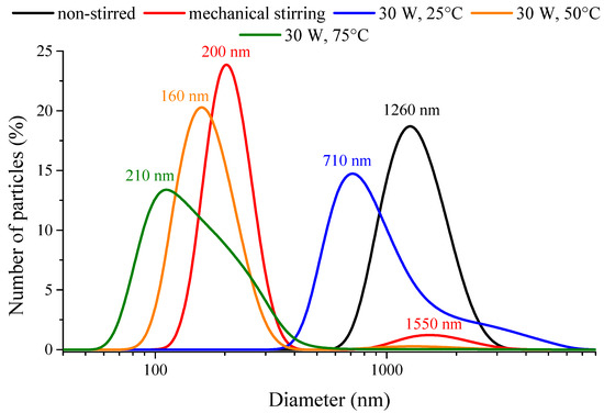 The polydispersity indices (PdI) (from 0.147 to 0.404) obtained from dynamic light scattering measurements attested no strict correlation between the character of the synthesis method used and the heterogeneity of sizes/size distribution of nanoparticle aggregates (Table 1). Nevertheless, the PdI values were largely lower for the ultrasonically prepared samples compared to the mechanical stirred one, but always higher than the non-stirred case. Unimodal size distributions were mostly observed at room temperature, except when mechanical stirring or the highly intense (120 W) continuous ultrasonic treatment was applied. In these instances, bimodal distributions were observed (Figure 3). At 50 °C and 75 °C, the nanoparticles formed secondary, aggregated particles in the range of 50–600 nm with high polydispersity index values of 0.593 and 0.436, respectively. The ultrasound treatment had crucial effects on the aggregation tendency of the nanoparticles: the defragmentation influence of the destroyed cavitation voids with the vigorous mass transfer could overcome the attractive electrostatic and van der Waals forces between the particles. The investigation of the emission periodicity and the output power of the ultrasound treatment proved that the both parameters were essential, by their help, the polydispersity indices could be decreased compared to the mechanically stirred case. The variation of the ultrasound emission towards shorter sonication periods resulted in lower average solvodynamic diameters as did the ultrasonic treatments with amplifying the ultrasound power density; however, the highly intense (120 W) ultrasonic treatment could only result in the lowest solvodynamic diameter of the aggregates.